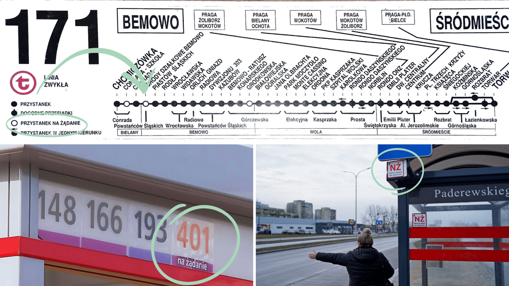Crucial Note: If you see "NŻ" (na żądanie = "on request") next to your bus number at the stop, the bus won't stop unless you wave to the driver. Similarly, if traveling on a bus and you see "NŻ" next to a stop name where you want to get off, you must signal the driver by pressing the STOP button as you approach the stop.
